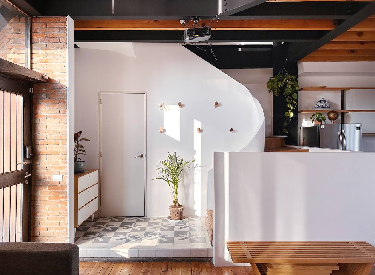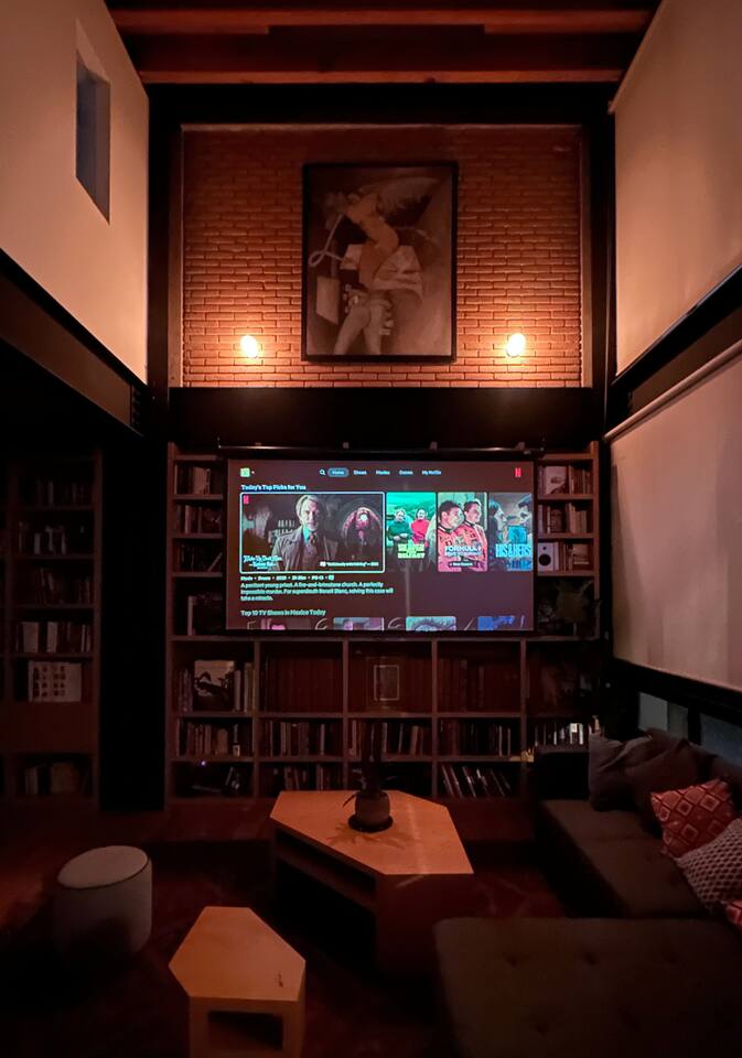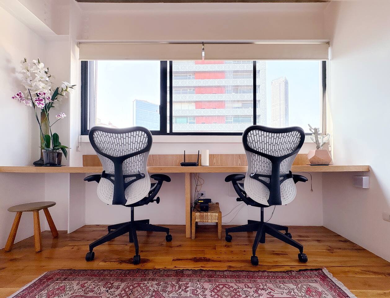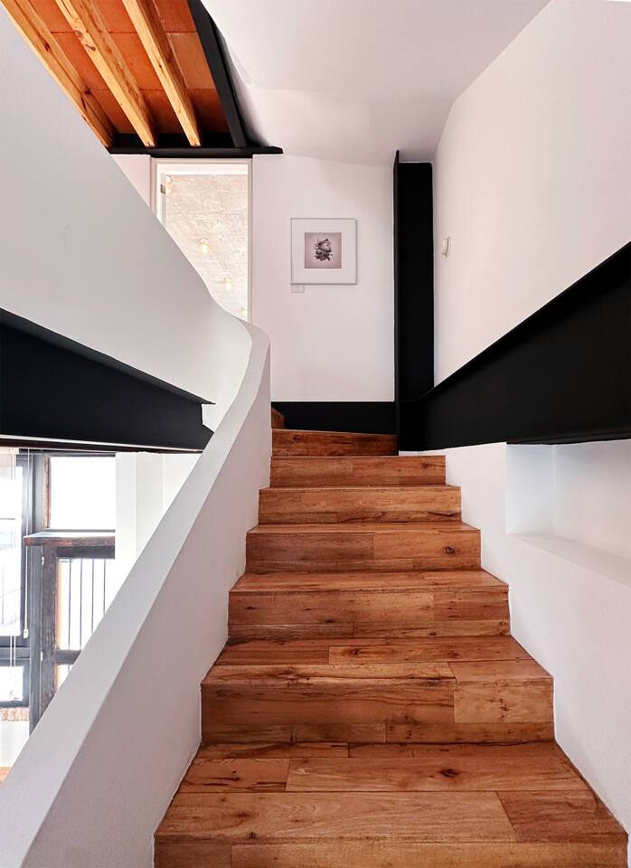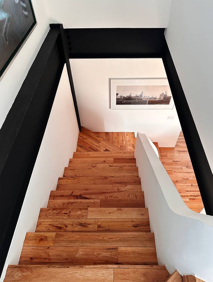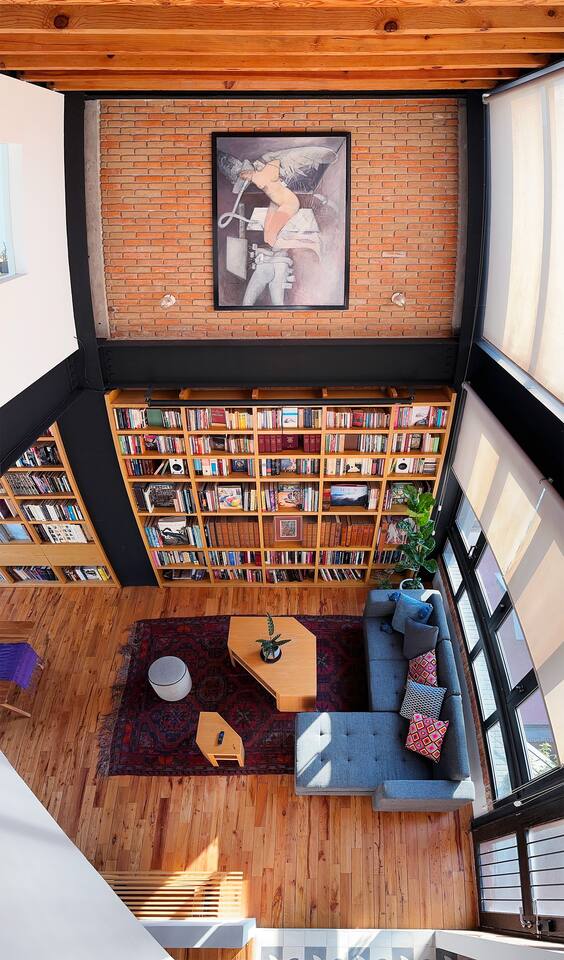 Bedrooms are on the apartment's 2nd floor, both of them set with black out curtains and AC. The master bedroom has a king size bed, a bathroom with both shower and tub and a large closet. The second bedroom has two dressers and two single beds which can be joined together to turn it into a split king size bed. The bathroom for the 2nd bedroom is across the hallway from it, and has a toilet, sink and shower, asa well as a lovely skylight for natural lighting. On the second level there's also a third room set up with two Herman Miller Mirra chairs and a desk in case you'd like to get some work done. On the first level there's a full kitchen equipped with large fridge, a dishwasher and a kitchen island. Next to it you'll find a four person dining table, a large balcony with its own set of table and chairs in case you'd like to have dinner al fresco. There's also a living room area with a library, comfortable sofas, and a projector with a pull down screen for an outstanding movie watching experience. Lastly, on the third floor there's a large terrace with terrific views.