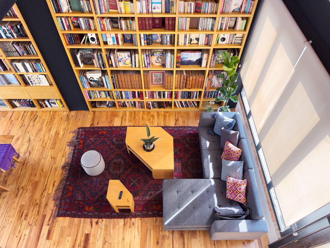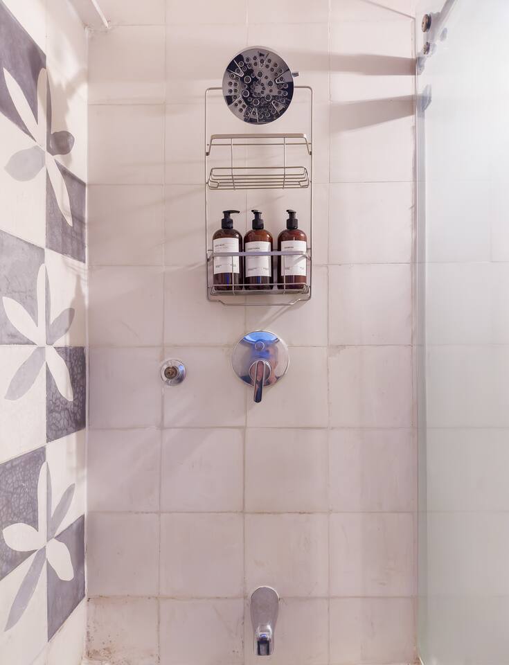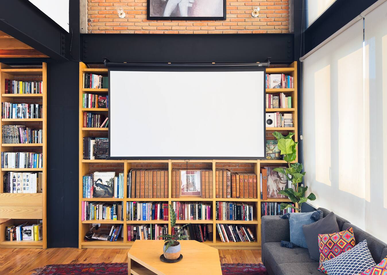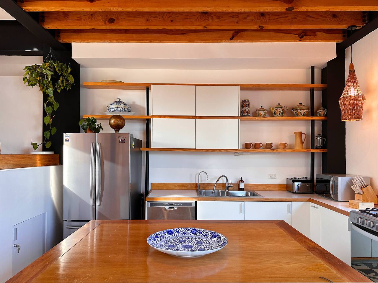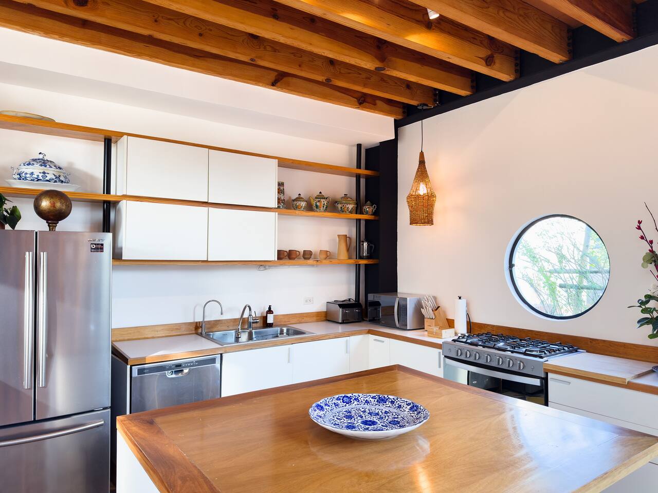 Bedrooms are on the apartment's 2nd floor, both of them set with black out curtains and AC. The master bedroom has a king size bed, a bathroom with both shower and tub and a large closet. The second bedroom has two dressers and two single beds which can be joined together to turn it into a split king size bed. The bathroom for the 2nd bedroom is across the hallway from it, and has a toilet, sink and shower, asa well as a lovely skylight for natural lighting. On the second level there's also a third room set up with two Herman Miller Mirra chairs and a desk in case you'd like to get some work done. On the first level there's a full kitchen equipped with large fridge, a dishwasher and a kitchen island. Next to it you'll find a four person dining table, a large balcony with its own set of table and chairs in case you'd like to have dinner al fresco. There's also a living room area with a library, comfortable sofas, and a projector with a pull down screen for an outstanding movie watching experience. Lastly, on the third floor there's a large terrace with terrific views.